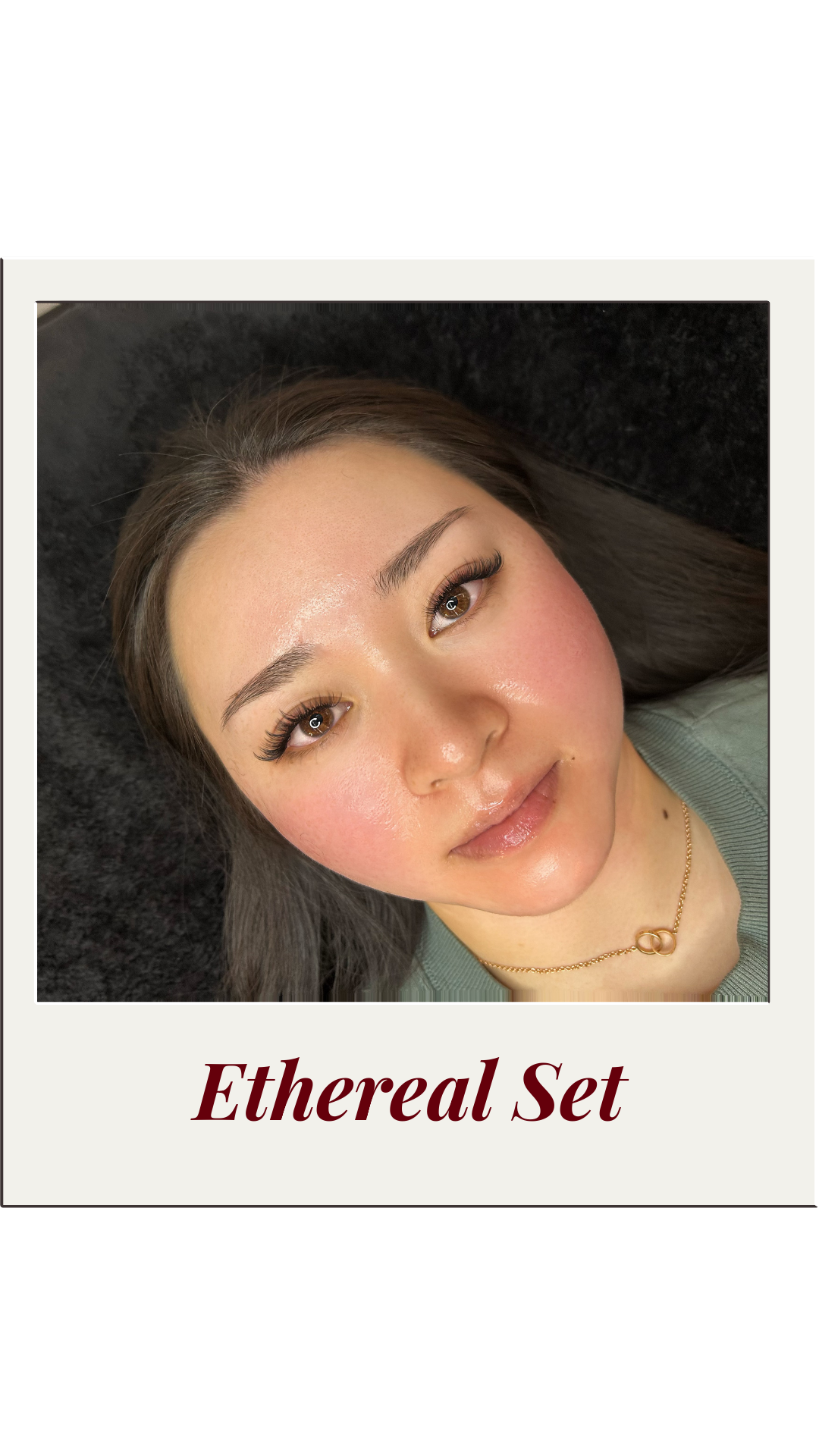 Close-up of a woman's face showcasing her freshly lifted eyelash extensions, with the text 'Lash Lift & Tint' below the image.